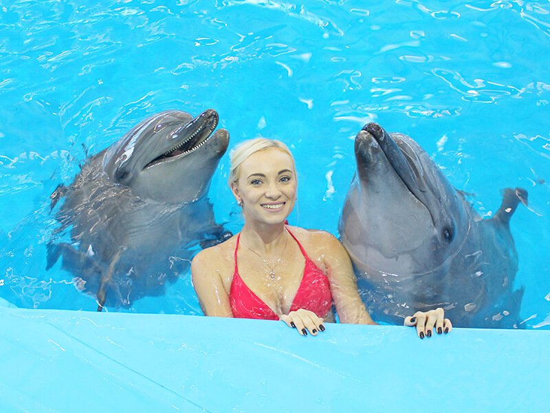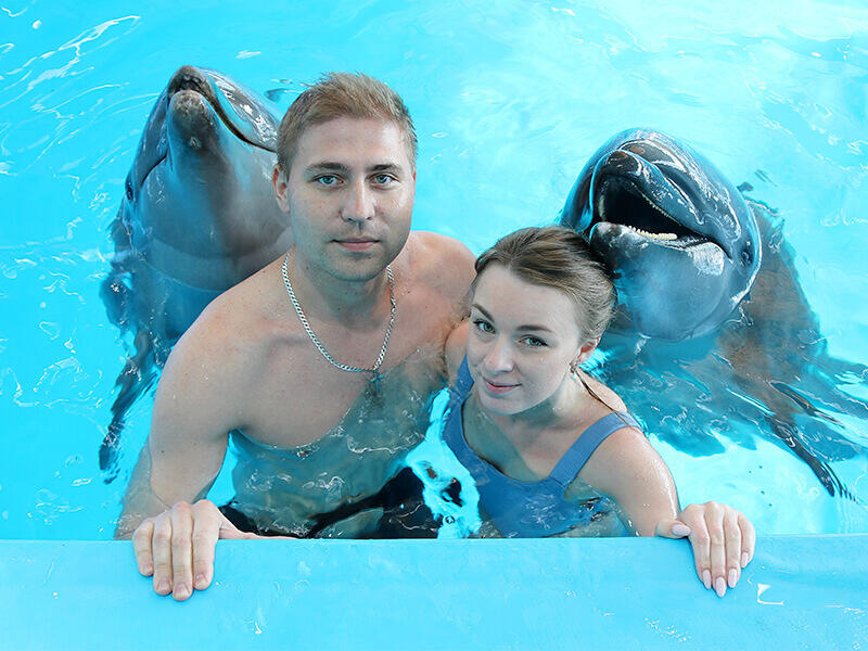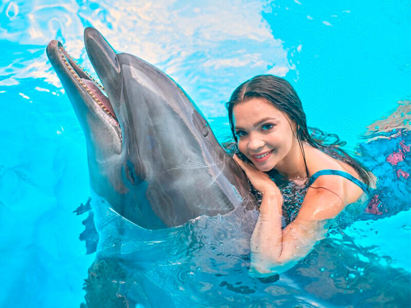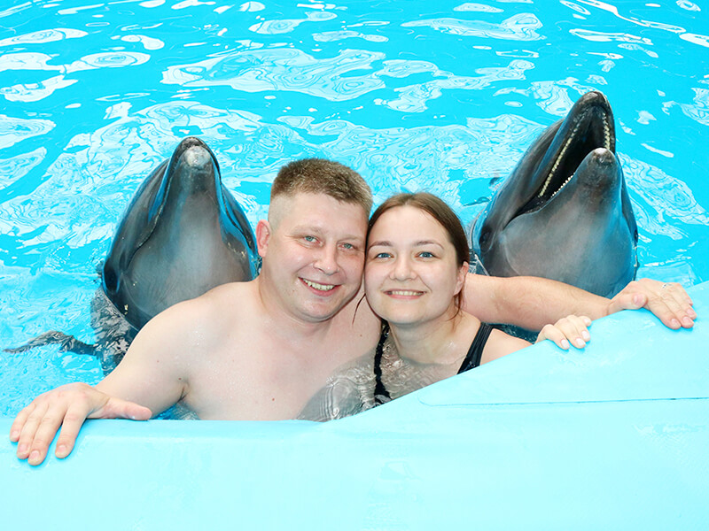 Вы спуститесь в воду, дельфины подставят Вам спинные плавнички и прокатят один круг по периметру бассейна и Вы получите незабываемое впечатление вместе с красивым фото формата А4 в подарок.