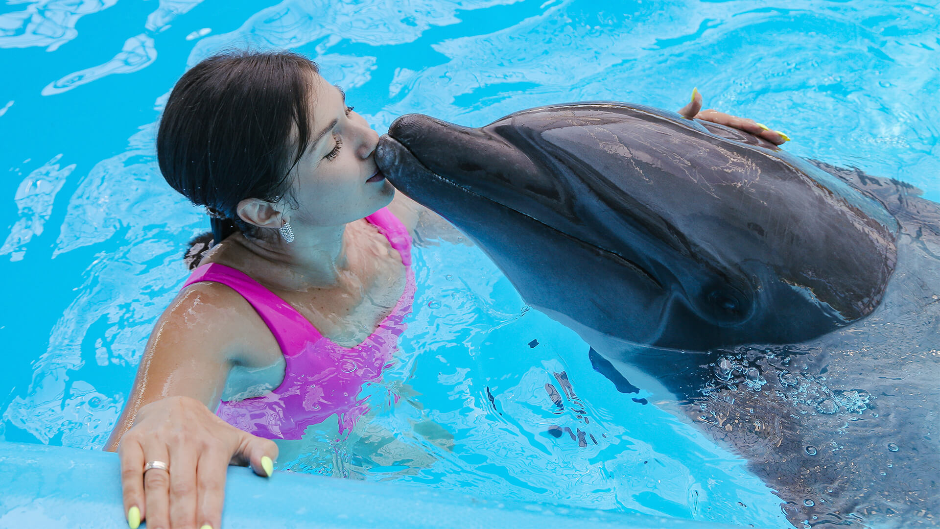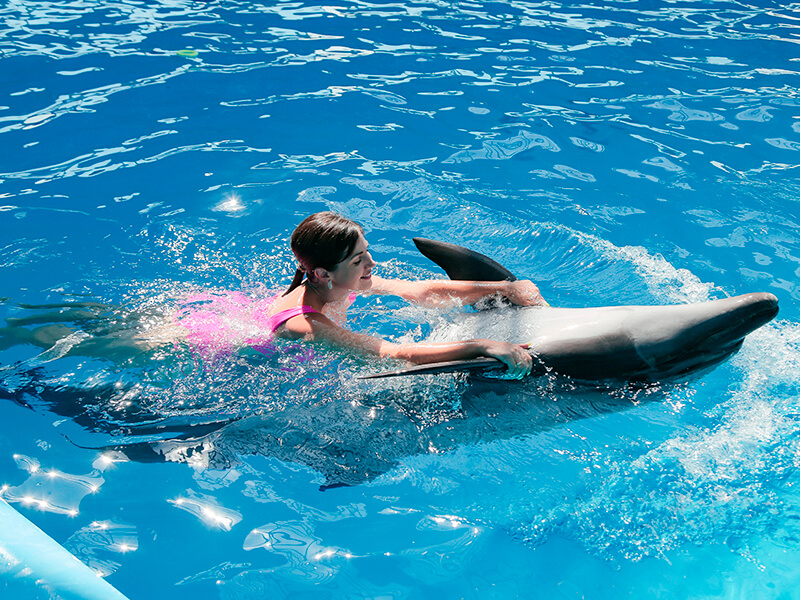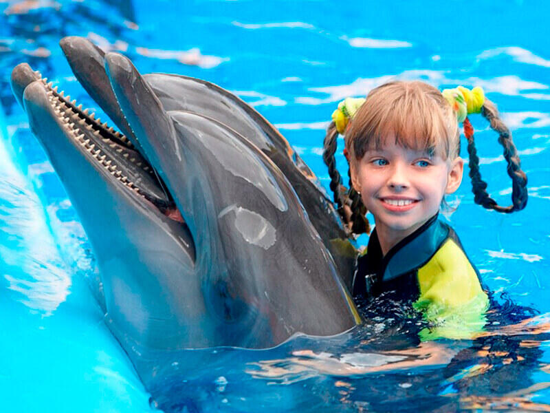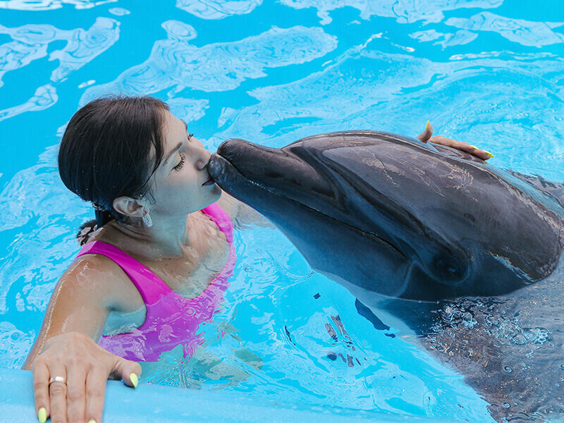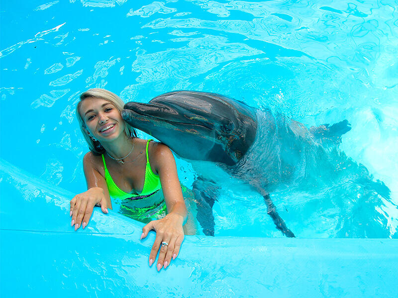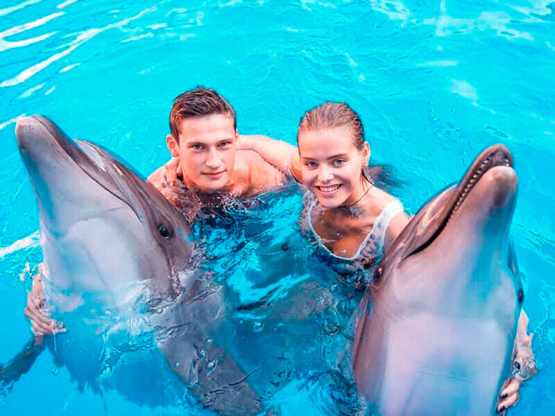 Дельфины будут играть с Вами, катать за плавнички и на животиках, Вы сможете погладить их, пообнимать, и даже потанцевать с ними.